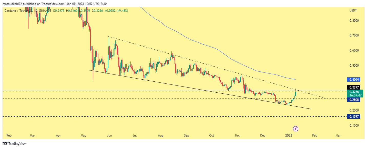 آدا از لحاظ قیمتی و تکنیکال نیز یک گام از اتریوم جلوتر است. و مقاومت قبلی را شکسته اما هنوز روند صعودی خود را به دست نیاورده است. برای اینکه کاردانو بتواند روند صعودی خود را دوباره به دست آورد. ابتدا باید خط روند نزولی را در تایم روزانه شکست و به سمت مویینگ 200 در محدوده 40 سنت حرکت کند. هر حرکتی زیر قیمت 0.35 سنت در روند نزولی قرار دارد و هنوز تارگت 0.17 سنت برای کاردانو در دسترس می باشد.