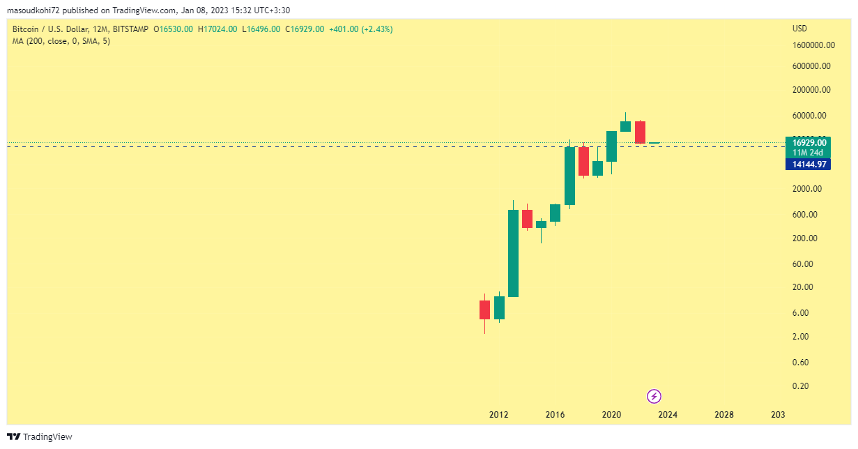 تنها ۷ روز از بسته شدن کندلهای ماهانه و سالانه بیت کوین گذشته است. کندل سالانه این رمزارز یکی از قرمزترین کندلهای نزولی تاریخچه بیت کوین بوده است. بسته شدن کندلهای ماهانه و سالانه از این لحاظ حائز اهمیت میباشد که قیمت نتوانست مقاومت حیاتی ۱۷۳۰۰ را دوباره بهعنوان حمایت باز پسگیری کند. لذا در حال حاضر هر صعودی در بیت کوین اصلاح برای ریزش بیشتر است و باید مراقب تلههای گاوی باشیم.