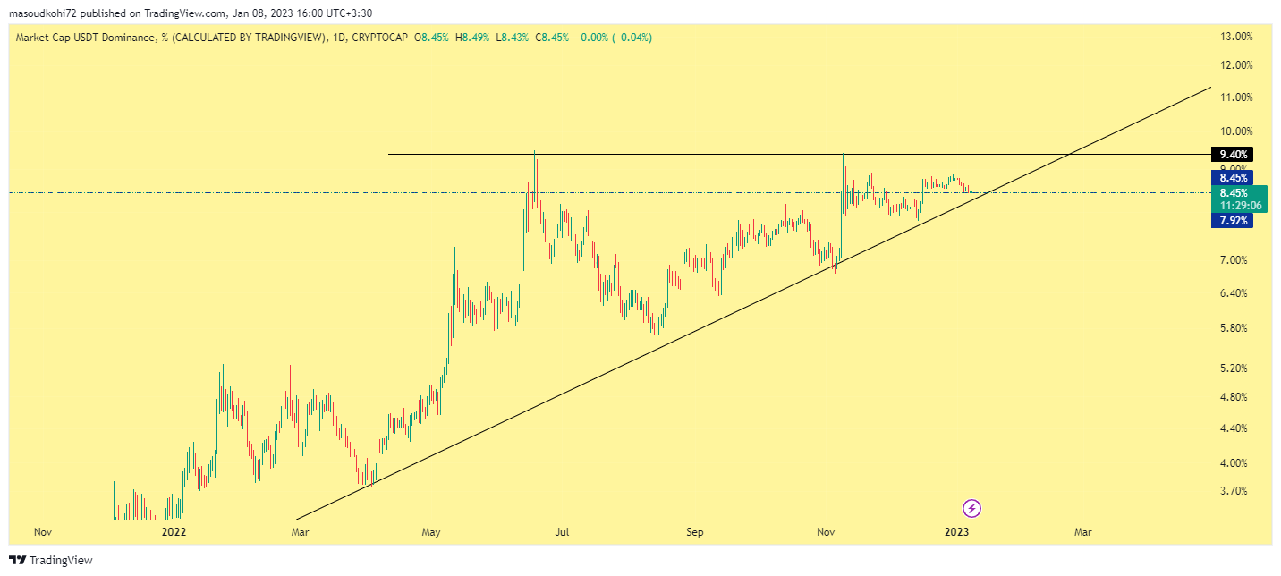 همانطور که در نمودار و تصویر زیر مشاهده میکنید دامیننس تتر نزدیک به خط روند صعودی خود میباشد و در طول هفته جاری میتواند تا خط روند، ریزش را تجربه کند. در صورتی که خط روند بهعنوان حمایت جدی عمل کند میتوانیم در هفتههای آینده شاهد صعود دامیینس و در نتیجه ریزش بازار باشیم در غیر اینصورت باید منتظر صعود بیت کوین و سایر داراییهای دیجیتال باشیم.