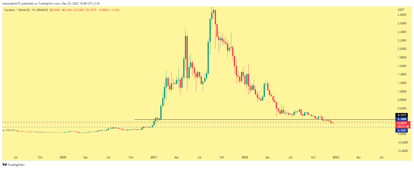 میتوان گفت کاردانو یکی از آلت کوینهای است که بیشترین ریزشها و حمایتها را از دست داده. در زمان نگارش این مقاله بیشتر از 90 درصد از سقف تاریخی خود یعنی 3 دلار فاصله گرفته است. حمایتهای قوی پیش روی کاردانو قرار ندارند و در هفتههای آینده میتواند خود را به پایینترین سطح ممکن یعنی 0.15 سنت برساند. مگر اینکه ورق کل بازار برگردد و آلت کوینها بتوانند صعودی کوتاه مدت را تجربه کنند.