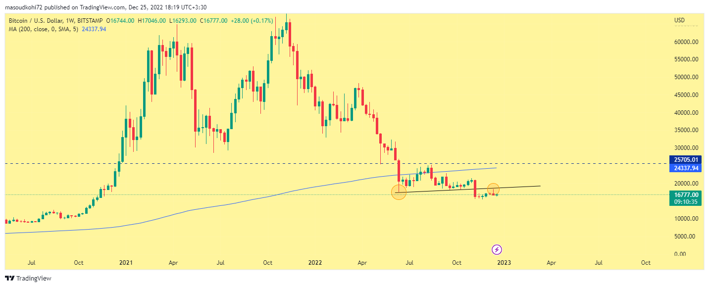 همانطور که قبلا خدمت کاربران گرامی عرض شد، هیچ تحلیلی بصورت کامل صدرصد درست و بدون اشتباه نیست. هر اتفاقی ممکنه در بازار رخ بدهد. فقط تنها مسالهای که فعلا بسیار واضح است این است که بازار در فاز نزولی خود به سر میبرد و تا زمانی که قیمت بیت کوین در تایم هفتگی با کندل پر قدرت مویینگ 200 را شکست ندهد، بازار خرسی ادامهدار خواهد بود. تحلیل این هفته از اهمیت بالای برخوردار است. زیرا نزدیک به تعطیلات میلاد مسیح هستیم و باید نگاهی دقیقتر نسبت به بازار داشته باشیم.