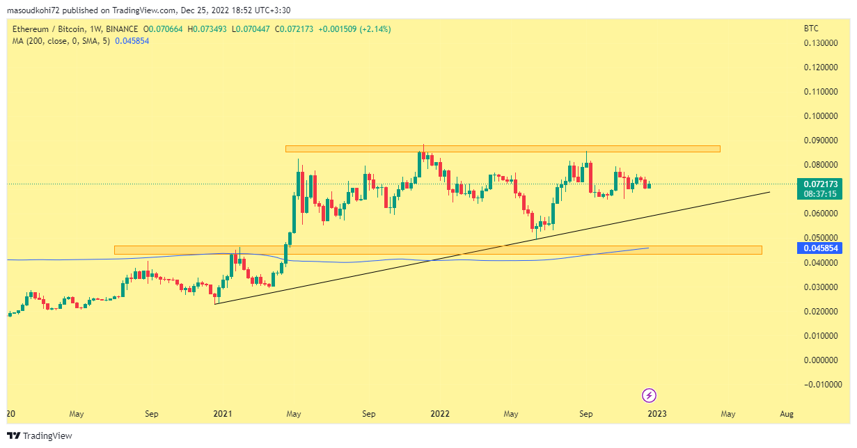 نموداری که در تصویر زیر مشاهده میکنید وضعیت اتریوم را در مقابل بیت کوین نشان میدهد که در تایم هفتگی از حمایتهای خوبی برخوردار است. انتظار میرود در آینده نزدیک اتریوم در مقابل بیت کوین کاهش قیمت را تجربه کند و در مقابل دامیننس بیت کوین صعودی باشد. با کاهش اتریوم و از دست رفتن حمایت هزار دلاری این ارز میتوان انتظار داشت سایر آلت کوینها نیز به دنبال کف قیمتی جدیدی باشند.