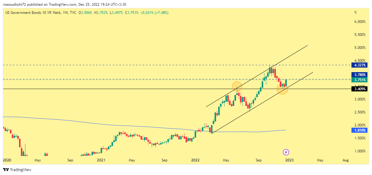 نموداری که در زیر مشاهده میکنید. چارت شاخص اوراق قرضه ده ساله در تایم هفتگی و در کف کانال صعودی خود قرار گرفته است. انتظار میرود در طول ماههای آینده این شاخص تا سقف کانال دوباره صعود را تجربه کند.