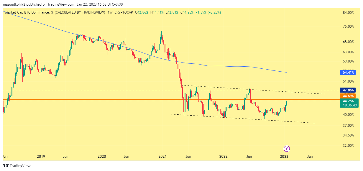 بزرگترین دلیلی که آلت کوین ها در این صعود همراه بیت کوین رشد نکردند را میتوان به دلیل صعود دامیننس بیت کوین دانست. برای پیگیری از وضعیت دامیننس بیت کوین حتما تحلیل های هفته های قبل ما را مطالعه کنید. این شاخص در حال حاضر با کندل های صعودی پر قدرتی به مقاومت خود نزدیک شده است. و اگر مقاومت 44 درصدی خود را شکست دهد، تسلط و چیرگی بیت کوین میتواند تا حدود 46 درصد افزایش یابد. در چنین شرایطی نباید انتظار پامپ های قیمتی عجیب و غریب را در آلت کوین ها داشت. اما اگر از همین محدوده شروع به اصلاح روند خود کند شرایط صعود برای آلت کوینها در هفته های آینده مهیا خواهد شد.
