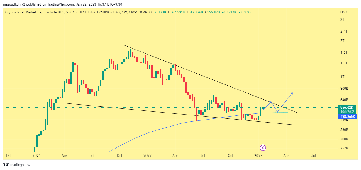 شاخص توتال 2 مارکت کپ آلت کوین ها منهای بیت کوین را به ما نمایش میدهد. از این رو دارای اهمیت بسیار بالای برای بررسی شرایط آلت کوین ها میباشد. این شاخص در حال حاضر شرایط بهتری نسبت به شاخص توتال دارد. و حداقل توانسته یک کندل صعودی نسبتا پرقدرت بالای مویینگ 200 به ثبت برساند. و در طول این هفته نیز با مقاومت سخت و قوی خط روند نزولی روبرو خواهد شد. همانطور که در چارت زیر مشاهده میکنید. این شاخص طبق الگوی که تشکیل داده است در هفته های آینده انتظار میرود بعد از برخورد اول به خط روند نزولی اصلاح و استراحتی را در مسیر صعود داشته باشد. و بعد از پولبک به مویینگ شکسته شده، خود را برای یک رالی صعودی آماده کند. در نتیجه در طول ماه آینده میتوان شرایط بسیار جذابی را برای آلت کوین ها متصور شد.