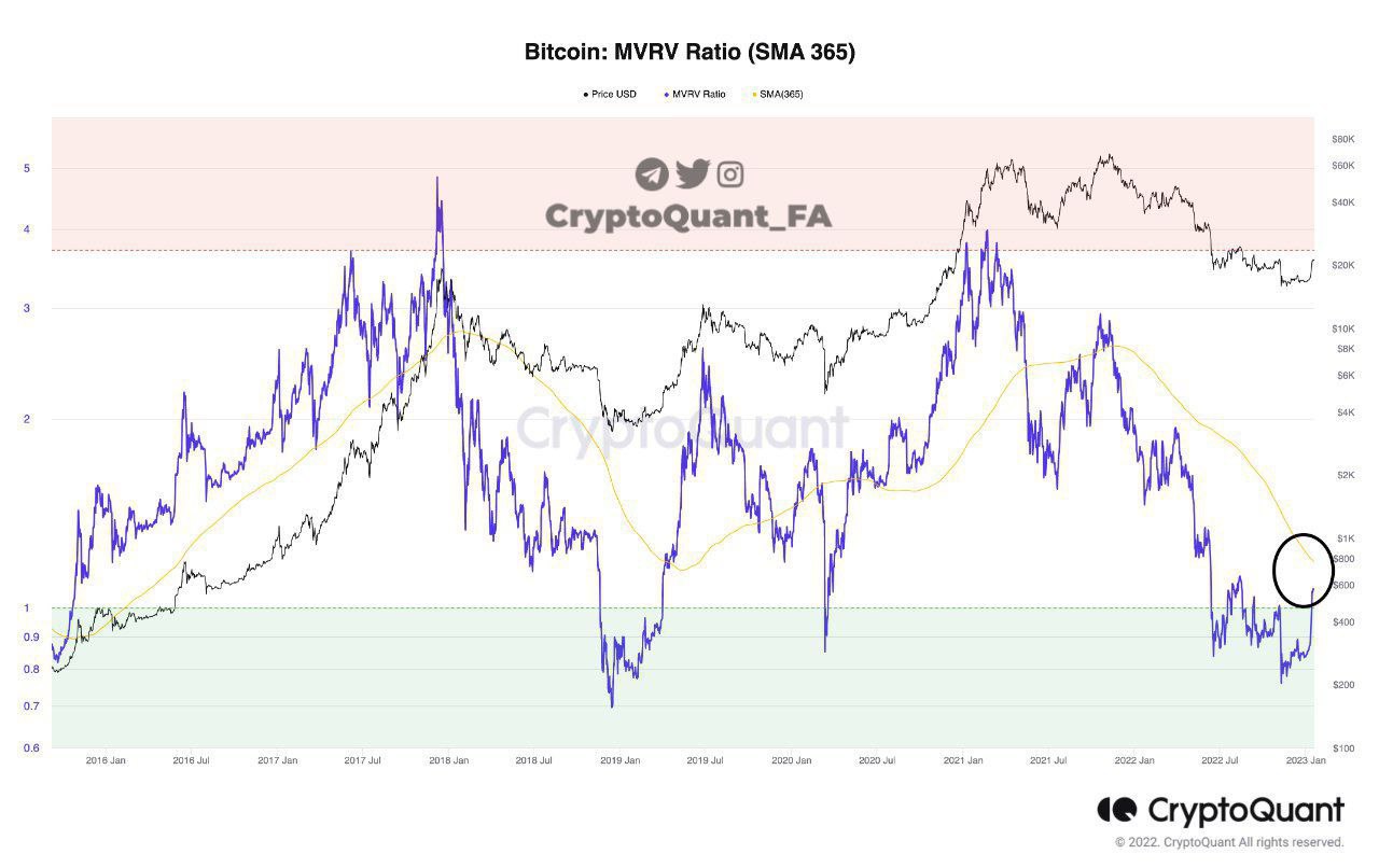 دومین معیار MVRV Ratio است که از نسبت میان قیمت و Market Cap بیتکوین حاصل میشود و از این طریق نشان میدهد که دارایی بیش از ارزش عادلانه خود قیمت دارد و یا بالاتر از آن. در حال حاضر معیار MVRV بالای عدد ۱ قرار گرفته است. و در نزدیکی میانگین سالانه خود (خط زرد رنگ) قرار دارد که نشان میدهد احتمال آغاز روند جدید برای بیتکوین ایجاد شده است.