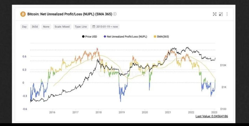 سومین معیار NUPL است که از اختلاف میان Market Cap و Realized Cap حاصل میشود؛ به عبارتی اختلاف میان سود و یا ضرری که سرمایهگذاران در اختیار دارند و هنوز آن را نقد نکردهاند. این معیار نیز مانند معیار MVRV Ratio به میانگین سالانه(خط نارنجی رنگ)خود نزدیک شده است که احتمالاً نشانهی آغاز روند جدید باشد