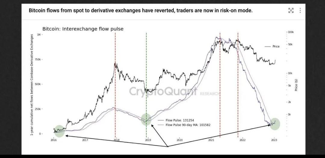 اولین اندیکاتور به جریان تبادلات میان صرافیها مربوط میشود. زمانی که کوینها از صرافیهای Spot به صرافیهای مشتقات منتقل میشوند، این تحرکات یعنی سرمایهگذاران برای افزایش سودآوری خود ریسکپذیرتر شدهاند و برای انجام معاملات اهرمی، دارایی خود را به صرافیهای مشتقات میفرستند.