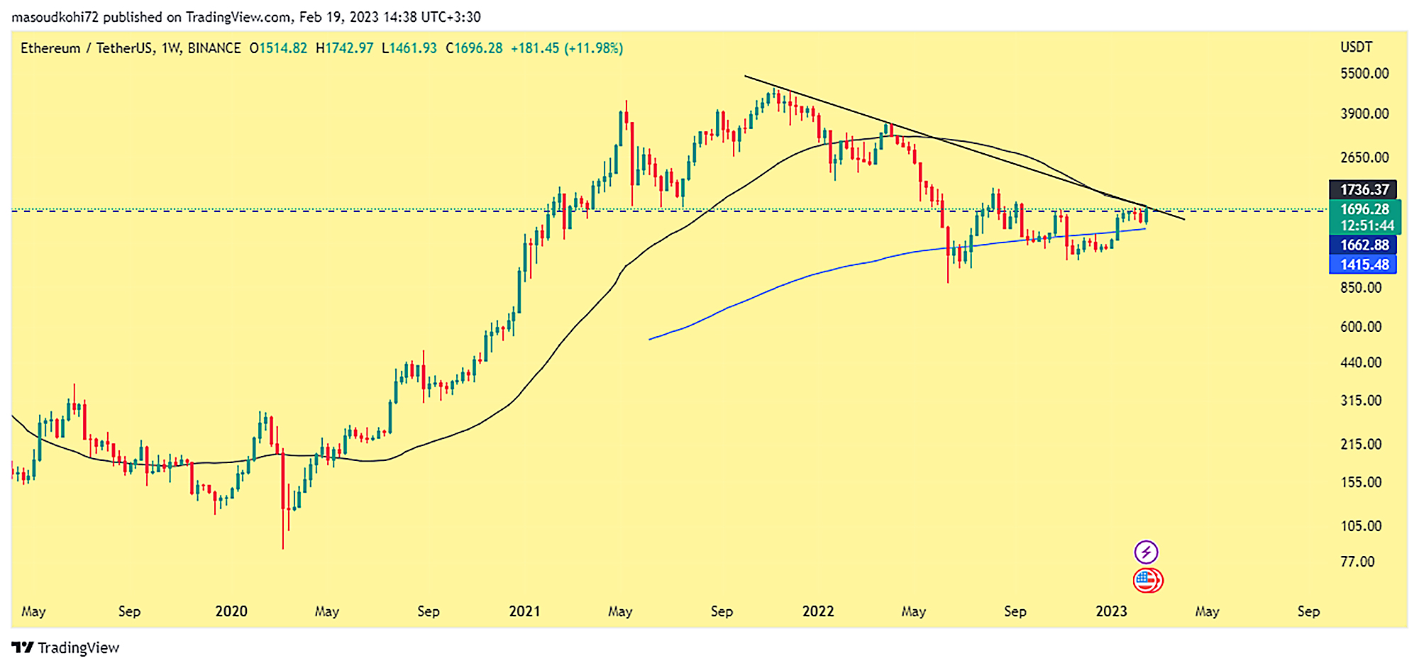 اتریوم نیز در شرایط مشابه با بیتکوین قرار دارد و سطح 1700 دلار برابر است با خط روند نزولی بلند مدت این آلت کوین. هرچند اتریوم عملکرد بسیار بهتری نسبت به بیتکوین و سایر رقبای خود داشت، و در نزول اخیر بازار به سمت کف قیمتی جدیدی حرکت نکرد. اما لازمه آغاز روند صعودی بلندمدت این ارز دیجیتال و سایر آلت کوینها، عبور قیمت اتریوم با کندل هفتگی از 1700 دلار است؛ در غیر اینصورت اصلاح را در پیش خواهد گرفت.