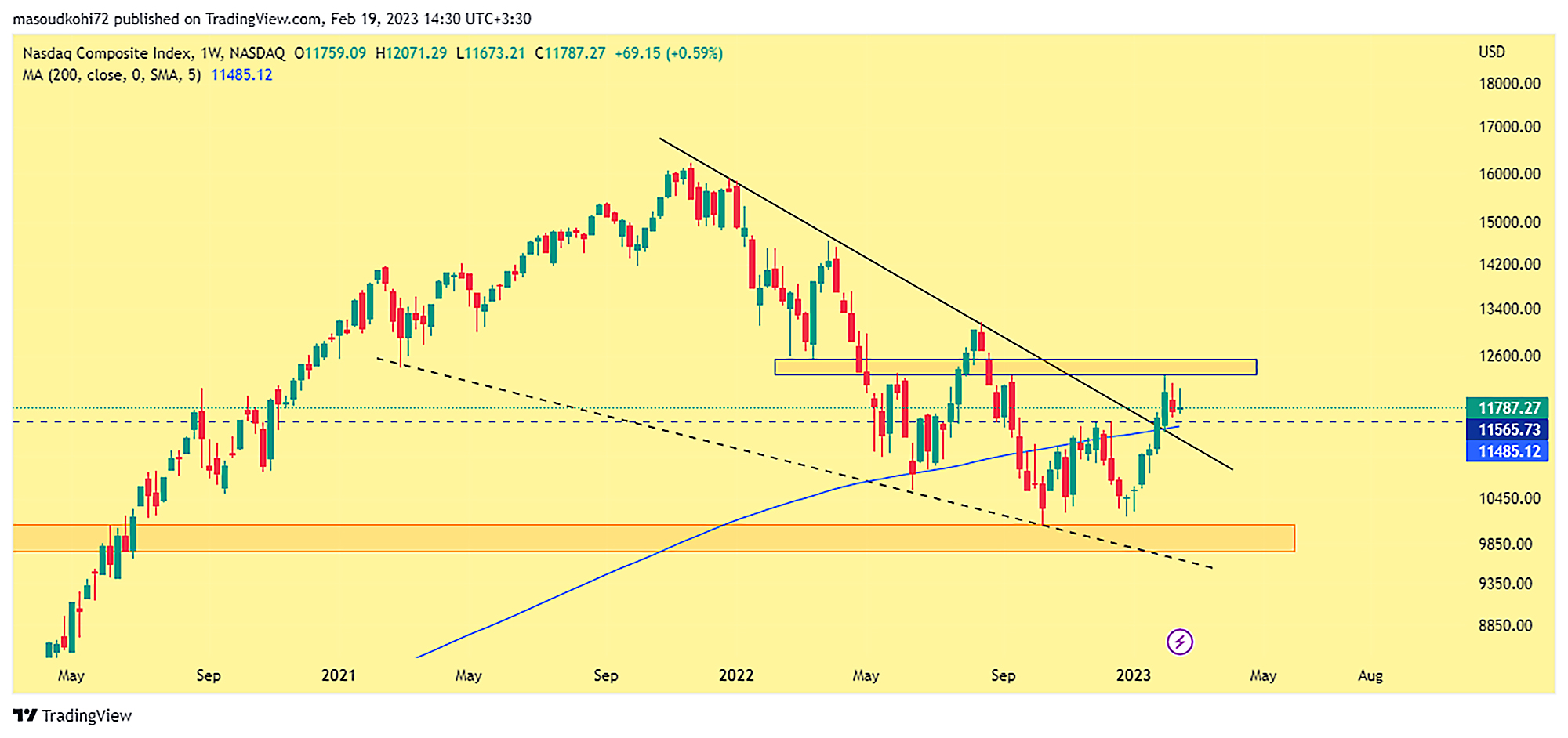از آنجایی که روند بیتکوین با سهام آمریکا گره خوردهاست، برررسی این شاخص دارای اهمیت بالایی است. هفته گذشته دادههای کلان اقتصادی منتشر شد، و بسیار بیشتر از تصور و پیشبینی کارشناسان بود. همین مساله باعث شد روند صعودی نزدک متوقف شود و در مقابل شاخص دلار تا محدوده 104 رشد کند. شاخص نزدک برای اینکه بتواند به صعود خود ادامه دهد، باید حمایت خود را در محدوده مویینگ 200 که در قیمت 11500 قرار دارد حفط کند. با حفظ این حمایت داراییهای ریسکی مانند سهام و کریپتوکارنسیها میتوانند به صعود ادامه دهند.