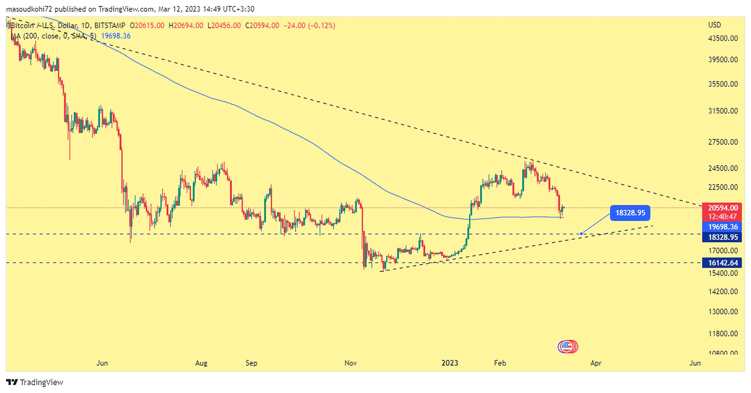 بعد از اخبار ورشکستگی بانکهای سیلورگیت و سیلیکون ولی و اتفاقات منفی هفته گذشته، بیت کوین ناحیه 23400 را به یک مقاومت قدرتمند تبدیل کرده است. همچنین از همین ناحیه شروع به ریزش تا محدوده 19500 و مویینگ 200 در تایم روزانه کرده است. فعلا موینگ 200 در 19500 حمایت خود را نشان داده است و انتظار میرود که قیمت بعد از یک صعود تا محدودههای 20900 الی 22000 که دارای گپ CME است، شروع به ریزش کند و اولین تارگت آن شکست مویینگ 200 و رسیدن به قیمت 18300 باشد. این نکته را نباید فراموش کنید که فردا جلسه اضطراری فدرال رزرو برگذار خواهد شد، و لحن بیان یا تصمیمات در این جلسه میتوانند سرنوشت ساز باشند و سناریوهای نزولی را بی اعتبار کنند.