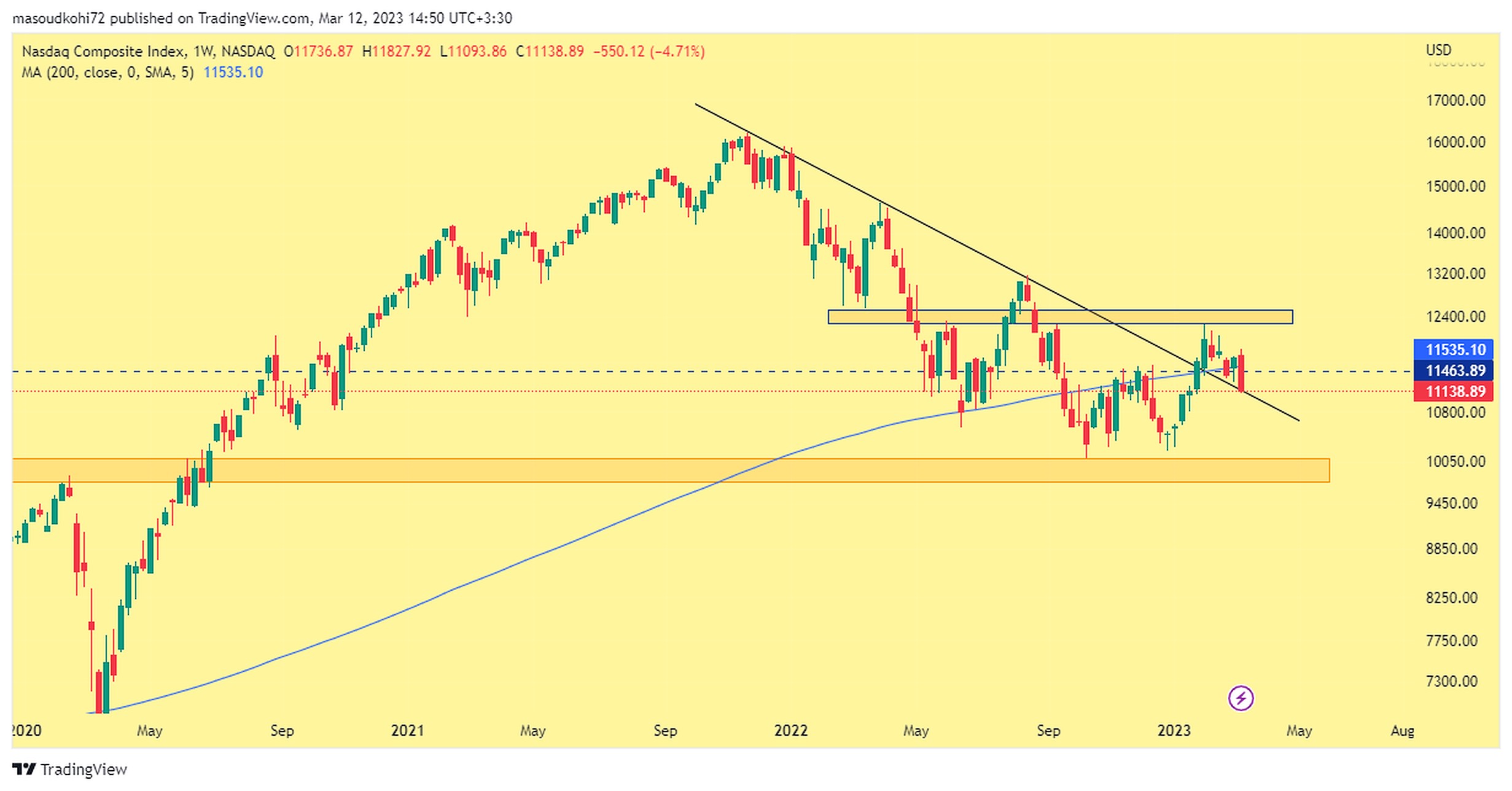 قیمت شاخص نزدک دوباره به زیر مویینگ 200 در تایم هفتگی نفوذ کرد و هماکنون روی خط روند نزولی بلند مدت قرار گرفته است. درصورتیکه این خط روند را به پایین بشکند، اوضاع برای کریپتوکارنسیها و دیگر داراییهای ریسکی به شدت بحرانی خواهد شد. همچنین بازارها دچار اصلاحات قیمتی شدیدی میشوند. با این وجود اگر حمایت خود را حفظ کند دوباره وارد روند صعودی خواهیم شد.