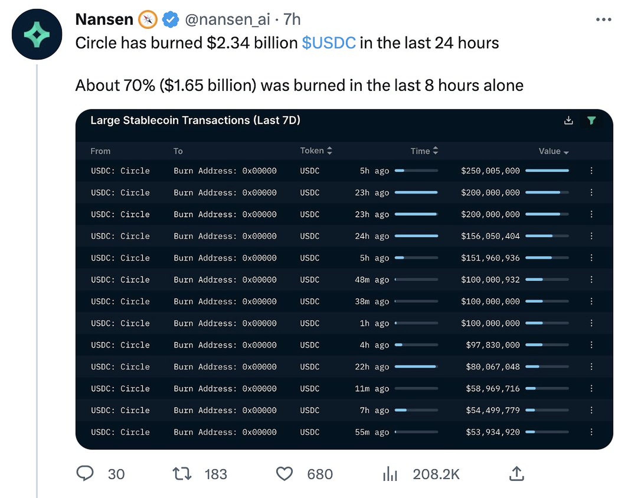 سیرکل در 48 ساعت گذشته 2.34 میلیارد دلار USDC سوزانده است اما اگر دادههای تاریخی را مشاهده کنید، این مقدار پول قابل توجهی نیست. این وضعیت USDC یک مورد کاملاً متفاوت از فروپاشی UST است. در ماه مه ۲۰۲۲ بنیاد لونا بیتکوینها را به صرافیها فرستاد و لونای نامحدودی را برای بازگرداندن پگ UST منتشر کرد که قبل از فروپاشی از طریق فعالیتهای آنچین قابلردیابی بود.