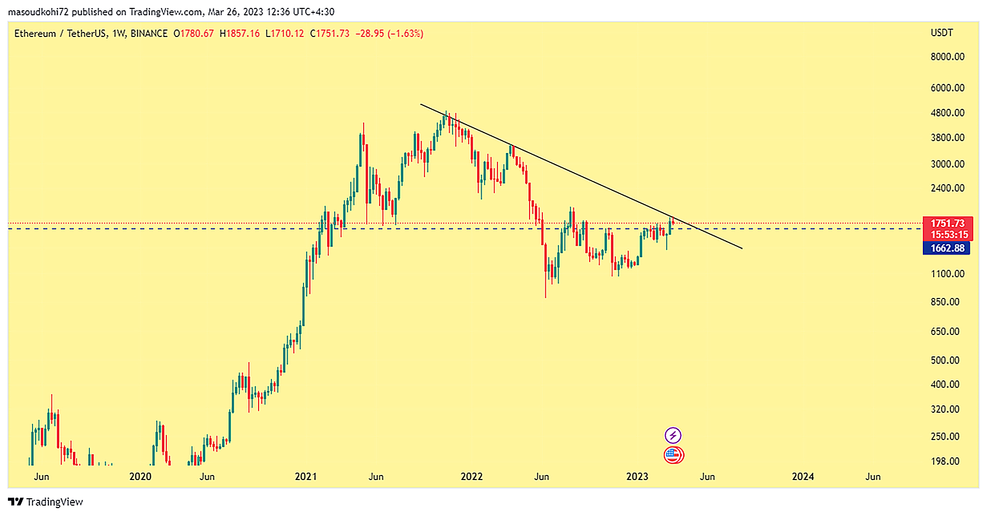 بیت کوین در تایم هفتگی با یک کندل بسیار قدرتمند از مویینگ 200 که یک مقاومت قوی بود عبور کرده است، و خود را به محدوده 29000 دلار رسانده است. این محدوده مربوط به زمانی است که مارپیچ مرگ پروژه لونا باعث نزول شدید کریپتو کارنسیها شد. به همین جهت پس گرفتن محدوده 29000 دلار بعنوان حمایت تاثیر روانی بسیار مثبتی بر بازار خواهد داشت. در شکل کندلها و چارتی که مشاهده میکنیم در حال حاضر بیت کوین روند کلان نزولی خود را شکست داده است. اگرچه در تایمهای پایینتر ممکن است پولبکی به سطح 25000 دلار داشته باشیم، اما فعلا در روند صعودی به سر میبریم و اگر پولبک احتمالی به سطح 25000 دلار موفقیتآمیز باشد برای یک بولران هیجان انگیز آماده خواهیم شد.