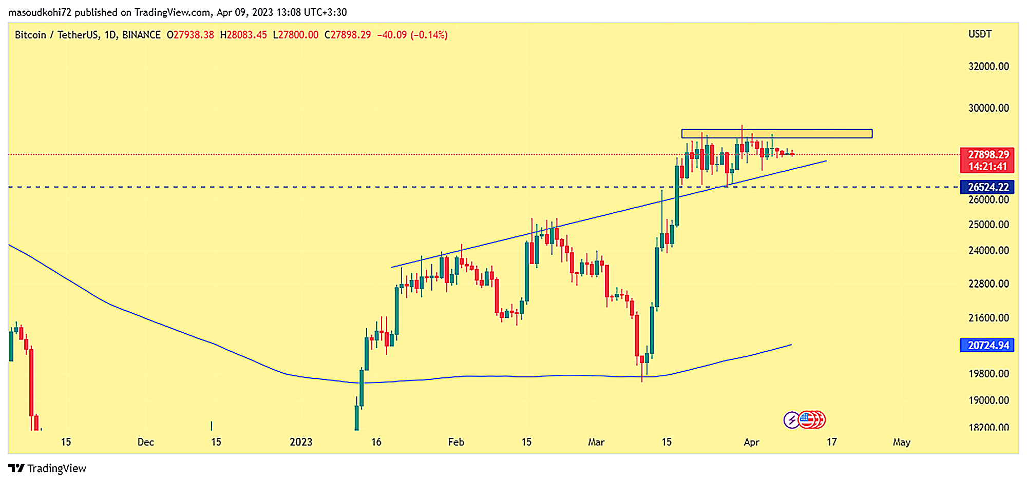بیتکوین در تایم فریم هفتگی بالاتر از مویینگ 200 و عدد 25000 دلار قرار گرفته است. فعلا به مدت 3 هفته است که قیمت در ناحیه 27 هزار دلار در حال رنج و تثبیت است. از نظر پرایس اکشن قیمت میتواند یک بار دیگر ناحیه 25000 دلار را بهعنوان پولبک برای صعود تست کند. اگر در انجام پولبک به این سطح حمایتی موفق عمل کند میتوان به رشد قیمت در آینده امیدوار بود، و تارگتهای بالاتری را برای بیتکوین متصور شد.