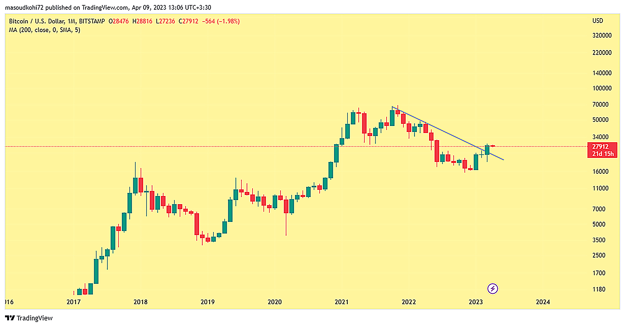 همانطور که در چارت زیر مشاهده میکنید bitcoin با یک کندل ماهانه بسیار قدرتمند روند نزولی بلندمت خود را شکست داده است و حالا در این ناحیه در تلاش برای شکست ناحیه مقاومتی 29000 دلار است. این ناحیه از نظر روانی از اهمیت بسیار بالای برخوردار است. زیرا 29000 دلار زمانی شکسته شد که پروژه لونا وارد مارپیچ مرگ شد پس گرفتن این ناحیه میتواند فضای کریپتوکارنسی را از نظر روانی بسیار مثبت کند.