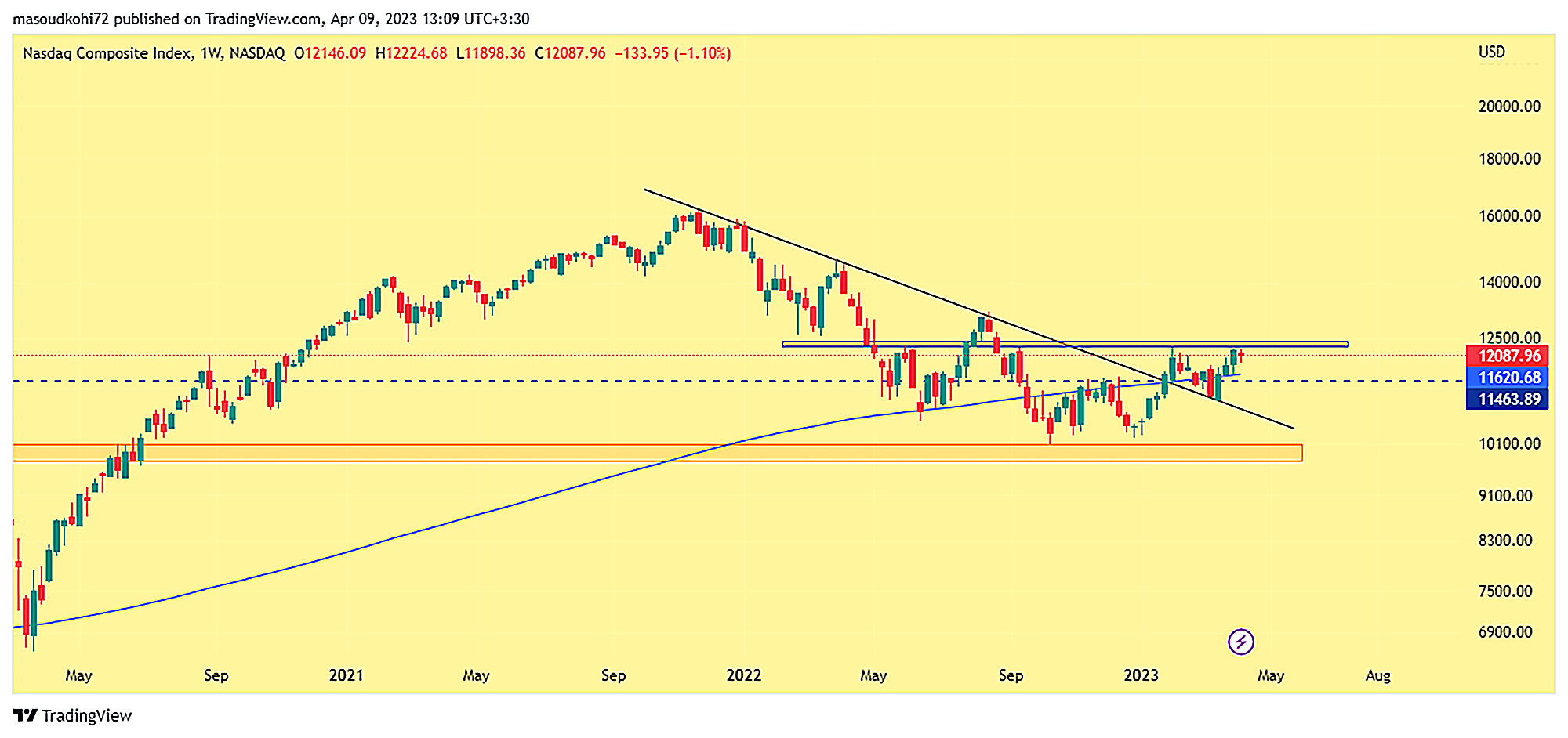 شاخص سهام نزدک برای دومین بار متوالی به سطح مقاومتی خود برخورد داشته است. فعلا بالاتر از سطح مویینگ 200 و خط روند نزولی در حال نوسان است، و تا زمانی که بالاتر از این سطوح معامله شود جای نگرانی برای نزول قیمت وجود ندارد. اما اگر در شکست مقاومت خود ناکام بماند انتظار فرسایش و رنج قیمت زیاد است. این نکته را هم باید مد نظر گرفت که شاخص دلار هم روی ناحیه حمایتی قرار گرفته است. حمایت برای شاخص دلار به معنای اصلاح و ریزش قیمت در بازار سهام و کریپتوکارنسیها است.