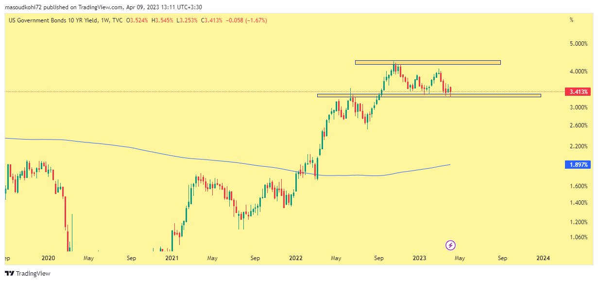 یک نکته بسیار مهم در چارت اوراق قرضه وجود دارد! زمانی که بانک سیلیکون ولی ورشکست شد، این بانک دارای تعداد بسیار زیادی از اوراق قرضه بود و با فروش این اوراق میتوانست خود را از ورشکستگی کامل نجات دهد، و باعث نزول و افت اوراق قرضه شود. در این صورت سیاستهای فدرال رزرو شکست میخورد و به اهداف تورمی خود دستیابی پیدا نمیکرد. اما از آنجا که دولت از فروش این اوراق توسط بانک جلوگیری کرده است. میتوان به این نتیجه رسید که فعلا فدرال رزور به سیاستهای پولی خود ادامه خواهد داد، و میتوانیم در آینده شاهده رشد این اوراق و شاخص دلار باشیم.