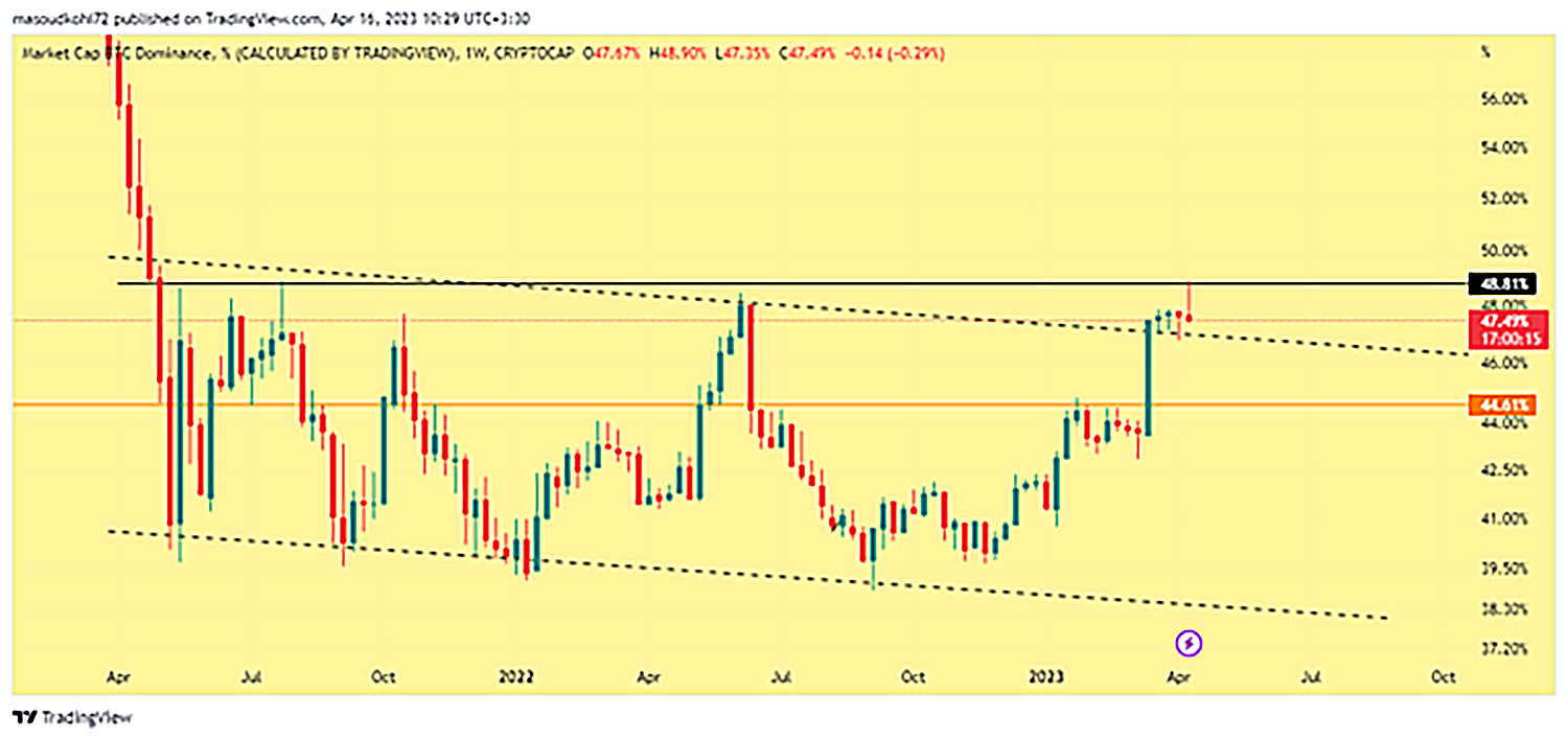 دامیننس بیت کوین به بالاترین سطح خود در طول چند ماه گذشته رسیده است و اکنون شکل کندل هفتگی خبر از نزول احتمالی در دامنیننس بیت کوین میدهد. اگر کندل هفتگی به همین شکل به کار خود پایان دهد، شرایط برای آلت کوینها بسیار جذاب خواهد بود. در طول هفته جاری و هفتههای آینده میتوان شاهد ورود سرمایه به برخی آلت کوینهای معتبر را مشاهده کرد، و در نتیجه پامپ قیمتی را در اکثر آلت کوینها شاهد خواهیم بود.