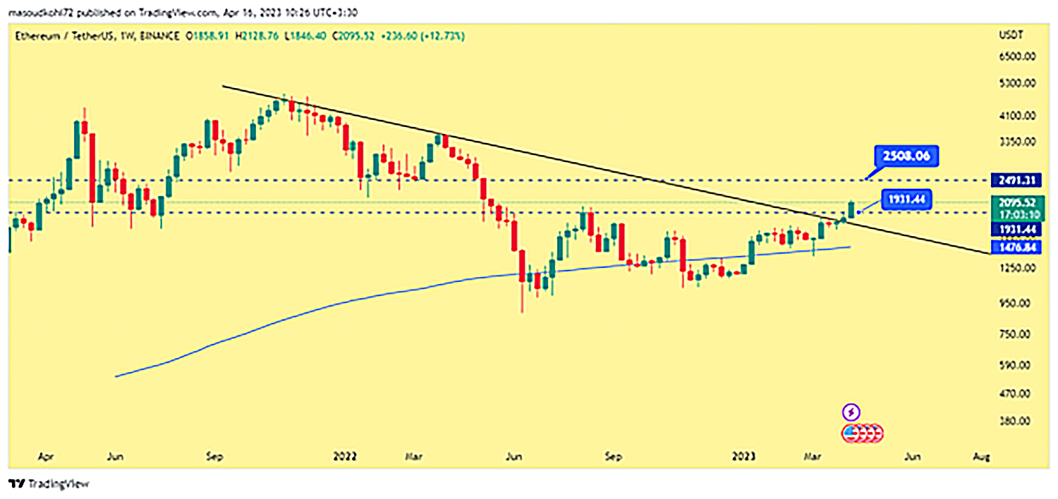 بعد از مدتها رنج و ضعف قیمتی در چارت اتریوم، میتوانیم شاهد قدرت و ورود سرمایه به دومین ارزدیجیتال در بازار باشیم. اتریوم از خط روند نزولی خود بصورت پر قدرت خارج شده است، و در حال حاضر با مقاومت 2100 دلار در حال دسته و پنجه نرم کردن است. اگر در طول هفته جاری بتواند از مقاومت 2100 دلار عبور، و یا حمایت 1930 دلاری خود را حفظ کند، میتوان به صعود این ارزدیجیتال تا تارگت 2400 الی 2500 دلار امیدوار بود.