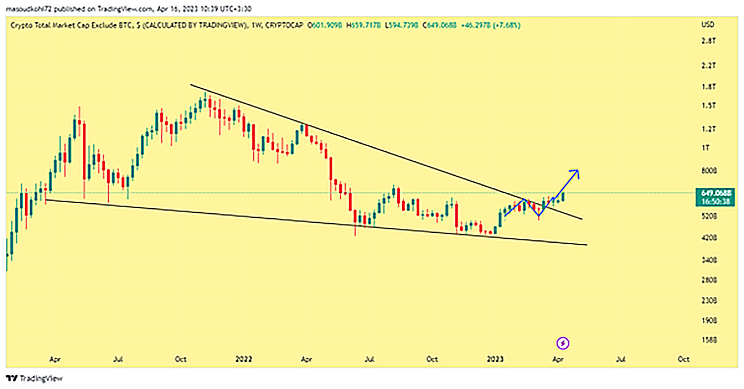 ما در وبلاگ اتراکس و مقاله، تحلیل بیتکوین :آیا روند صعودی بازار ادامه دار خواهد بود؟ به این موضوع اشاره کردیم که در آینده، این شاخص به چه صورت میتواند حرکت کند، و به خوبی طبق تحلیل و بررسی ما پیشرفت. از این ناحیهی مقاومتی به بعد شرایط شاخص توتال، برای آلتسیزن و ورود سرمایه مهیا خواهد شد. اگر این ورد سرمایه بعد از افت دامینس بیت کوین به درستی صورت بگیرد، شاخص توتال طبق چارت زیر میتواند به حرکت خود ادامه دهد.