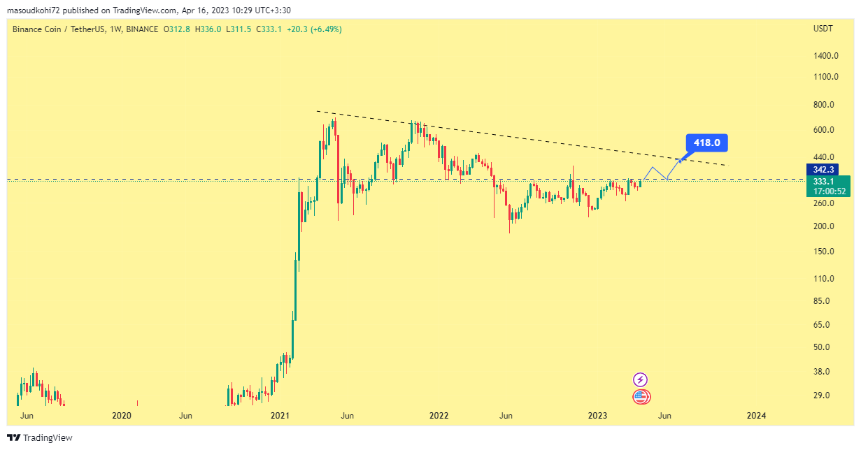 این سناریوی صعودی در صورتی معتبر است که bnb مقاومت 340 دلاری را شکست دهد.