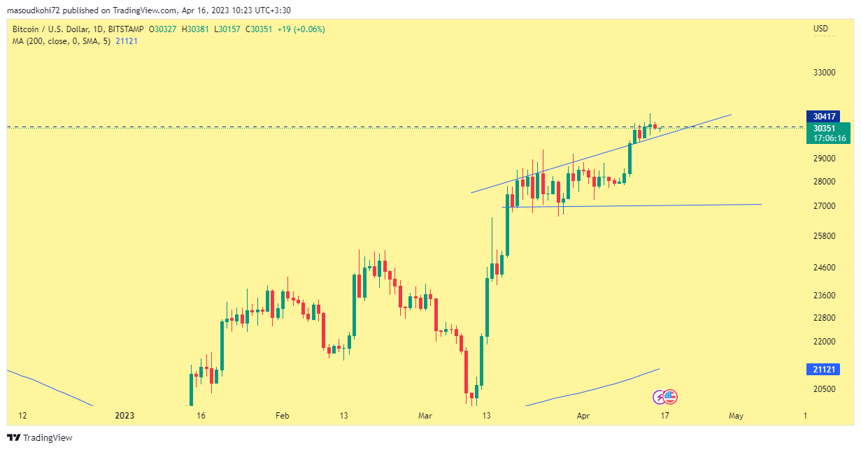 بیت کوین در حاضر سقف خط روند صعودی خود را شکست داده و توانسته پولبک موفقیت آمیزی به آن نیز داشته باشد. اما قیمت در ناحیه 29800 و 31 هزار دلار در نوسان قرار دارد، تا زمانی که ناحیه حمایتی 29800 در تایم فریم روزانه از دست نرود میتوان در کوتاه مدت به صعود بیشتر قیمت امیدوار بود و در صورتی که این ناحیه را از دست بدهیم تارگتهای زیر 29 هزار دلار در دسترس قرار خواهند گرفت.