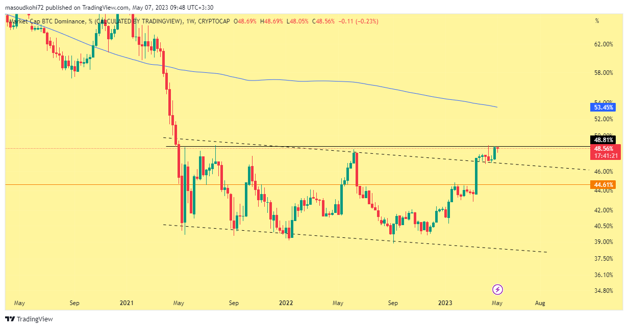 در حال حاضر دامیننس بیتکوین در محدوده مقاومتی 48.53 در حال نوسان است و نشانی از ضعف در آن مشاهده نمیشود. اگر دامیننس صعود خود را به سمت 50 درصد ادامه دهد شرایط برای آلتکوینها بدتر خواهد شد. اما اگر از همین ناحیه اصلاح را در پیش بگیرد آلتکوینها میتوانند یک رالی صعودی را تجربه کنند.