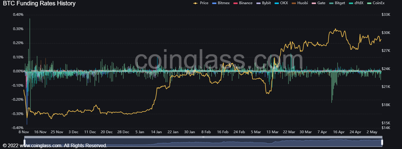 در سه روز گذشته درصد بالایی از معاملهگران در پوزیشن لانگ قرار داشتهاند و امکان دارد در حرکت اول بیتکوین تا نواحی 30 هزار دلار رشد را تجربه کند. بعد از آن بزرگان بازار یا بازارسازها شروع به لیکویید کردن تریدرهای کوچکتر کنند و قیمت را به سمت نواحی 27 هزار دلار هدایت کنند. فاندینگ ریت را زیاد نمیتوان در تایمهای پایین معتبر دانست. برای بررسی دقیق، باید یک هفته الی 10 روز این شاخص را زیر نظر داشت و بعد تصمیم به انجام معامله گرفت. زیرا گاهی مشاهده شده است تریدرها بیشتر از یک هفته در یک پوزیشن معاملاتی بودهاند بعد صرافیها اقدام به باز کردن پوزیشنهای مخالف جهت آنها کردهاند.