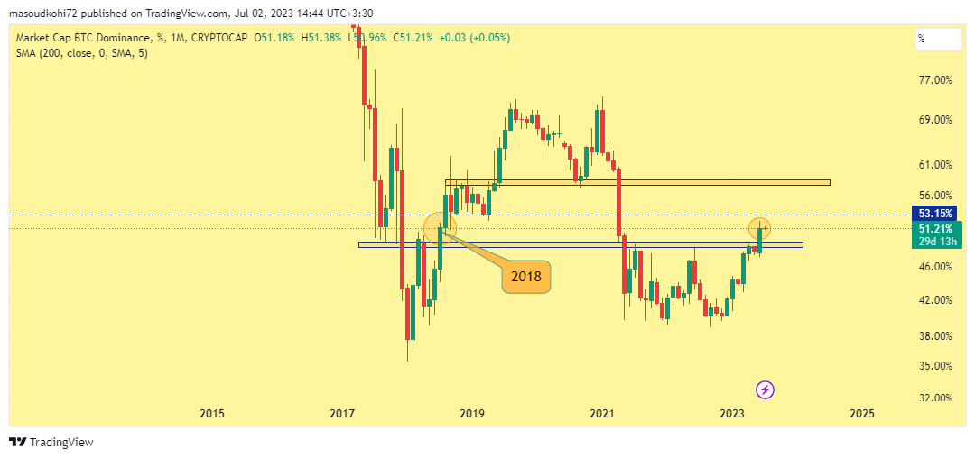 دامیننس بیتکوین باعث شده است تمامی آلت کوینها در یک روند کسل کننده و بدون تحرک باقی بمانند. سرمایهگذار نهادی و شرکتها در حال حاضر بیت کوین را به تمامی ارزهای دیجیتال ترجیح میدهند. دامیننس بیت کوین رفتار مشابهی را مانند سال 2018 تکرار میکند. در صورتیکه این رفتار ادامهدار باشد، در هدف اول به سمت تسلط 53 درصدی پیش خواهد رفت و در هدف دوم به سمت محدوده 59 درصد حرکت میکند. در چنین شرایطی نباید انتظار رشدهای چشمگیر از آلتکوینها را داشته باشید.