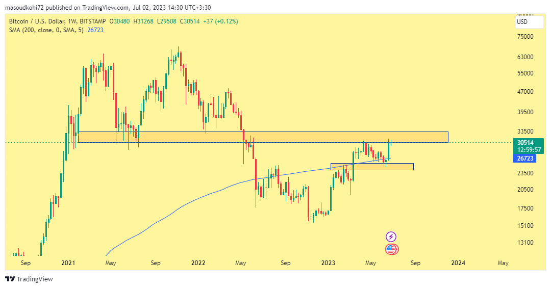 در یک ماه اخیر خبرها و رویدادهای بسیار مثبتی برای بازار ارزهای دیجیتال بهخصوص بیت کوین اتفاق افتاد و درخواستهای ETF شرکتهای بزرگ باعث شد بیتکوین از ناحیه 25 هزار دلار تا 31 هزار دلار رشد شارپی را تجربه کند. اما در هفته گذشته این درخواست رد شدند و باعث نزول جزئی در قیمت شدند. بهنظر میرسد تا زمانی که بیت کوین خود را بالای محدوده 29500 نگهداشته باشد این صعود میتواند ادامه دار باشد. حتی خود را به تارگتهای بالاتر از 35 هزار دلار نیز برساند.