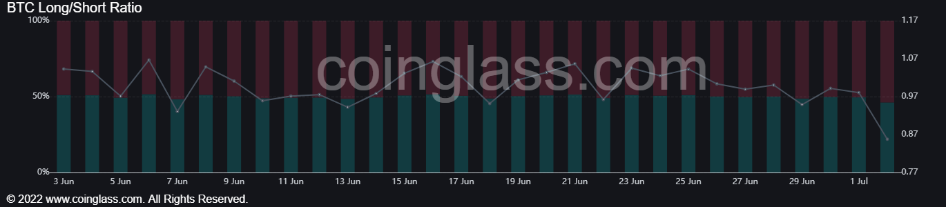 تا اینجای بررسی از تحلیل هفتگی شماره 26، بسیاری از شاخصها و دادهها صعود بیت کوین را نشان میدادند اما یک شاخص نشاندهند نزول شدید قیمت است. طبق دادههای آماری کوینگلس 53 درصد از معاملهگران در 24 ساعت گذشته وارد پوزیشن شورت شدهاند و این درصد کمی خطرناک بهنظر میرسد؛ زیرا به شدت میتواند باعث ریزش شارپ قیمت در روزهای آینده شود.