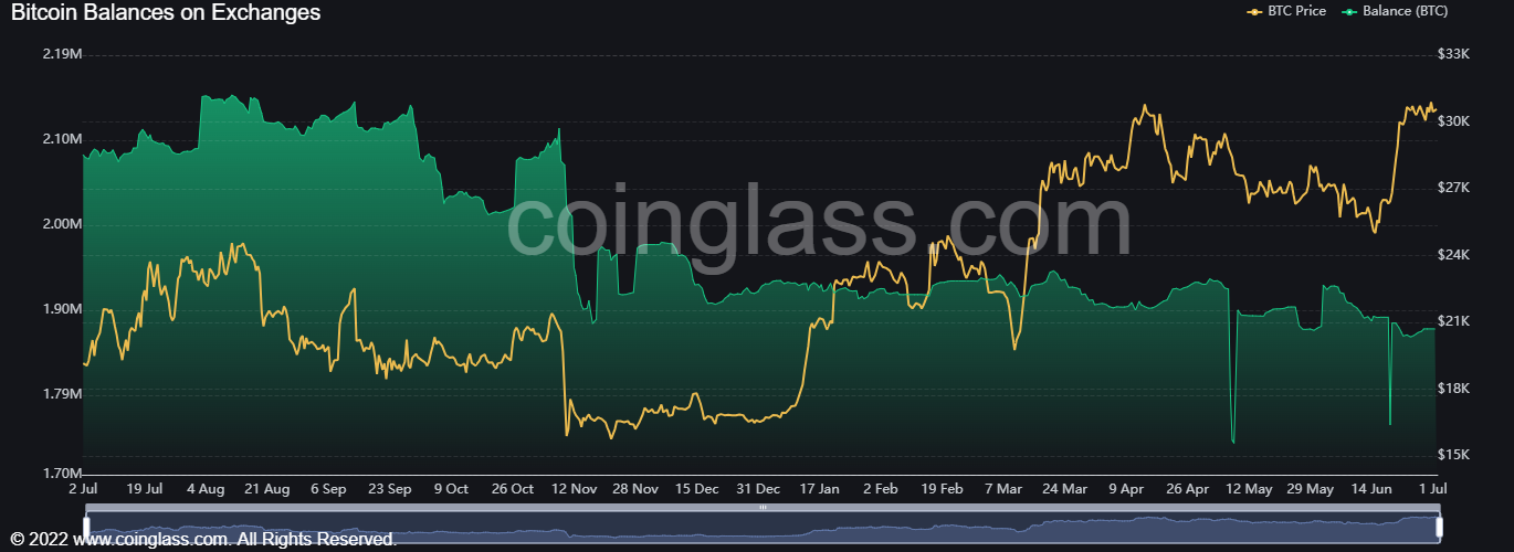 از زمانی که بیت کوین به ناحیه 31 هزار دلار رسیده است و توانسته به مدت بیش از یک هفته خود را در این ناحیه نگهدارد، حجم خروج و ورود بیت کوین به صرافیها نیز در یک حالت رنج باقی مانده است. بهگونهای که طبق دادههای کوین گلس در یک روز گذشته حدود 4 هزار بیت کوین به صرافیها وارد شدهاست و در هفته گذشته نیز حدود همین مقدار از صرافیها خارج شده است. از آنجا که حجم ورود و خروج در این شاخص تقریبا باهم برابر است نشاندهنده عدم قطعیت برای نزول یا صعود است و معاملهگر خرد در چنین شرایطی در حالت سردرگمی به سر میبرد.