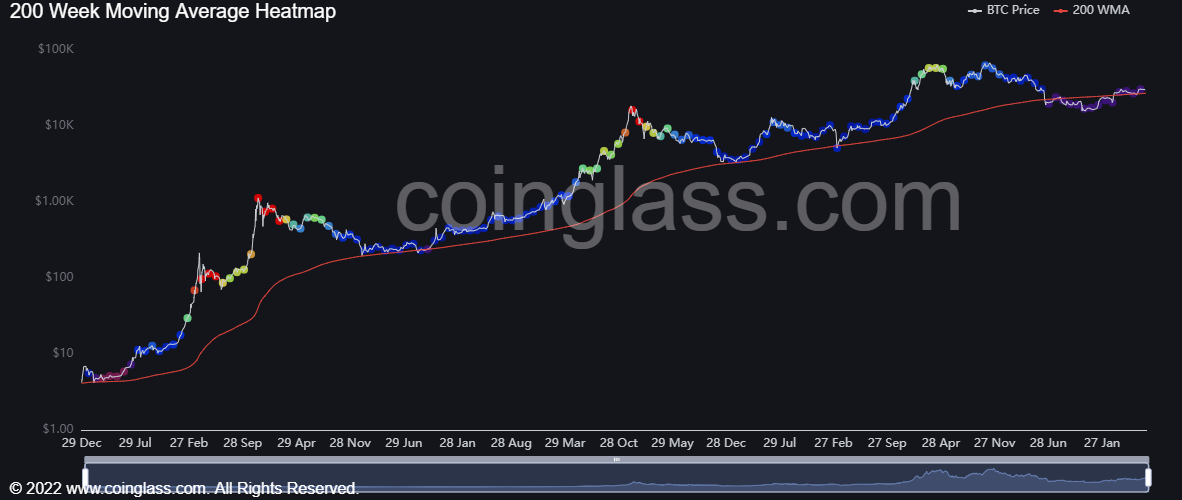 سرمایهگذار بلند مدت بیتکوین میتواند تغییرات رنگ ماهانه را بررسی کند. از لحاظ تاریخی، وقتی میبینیم که نقاط نارنجی و قرمز به نمودار قیمت اختصاص داده شده است، این زمان خوبی برای فروش بیتکوین با داغ شدن بیش از حد بازار بوده است. دورههایی که در آن نقاط قیمت بنفش و نزدیک به 200 هفته MA هستند، از لحاظ تاریخی زمان خوبی برای خرید بودهاند. در حال حاضر این شاخص با مقاومت 31600 دسته و پنجه نرم میکند و در صورت شکست این ناحیه، قیمت میتواند صعود بسیار قدرتمندی را تا 41 هزار دلار طی کند.