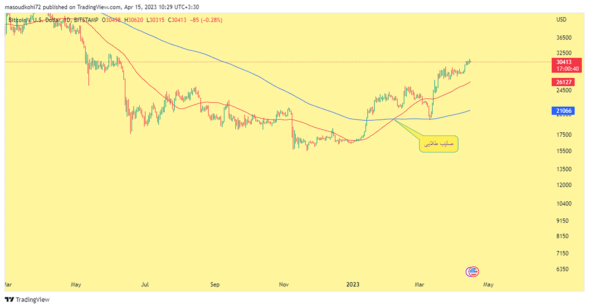 به اصطلاح “صلیب طلایی” زمانی اتفاق میافتد که یک MA کوتاهمدت و یک MA اصلی و بلندمدت به سمت بالا عبور کنند. صلیب طلایی (Golden cross) حاکی از افزایش قیمت و چرخش صعودی در بازار است.