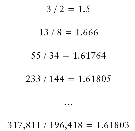 حالا زیبایی این اعداد یک نسبت مشخص شده است که به آن نسبت طلایی می گویند. اگر هر دو عدد متوالی را در دنباله بگیریم، نسبت آنها (Xn / Xn-1) به 1.618 نزدیک می شود که همان نکته ای است که ما آن را نسبت طلایی می نامیم: