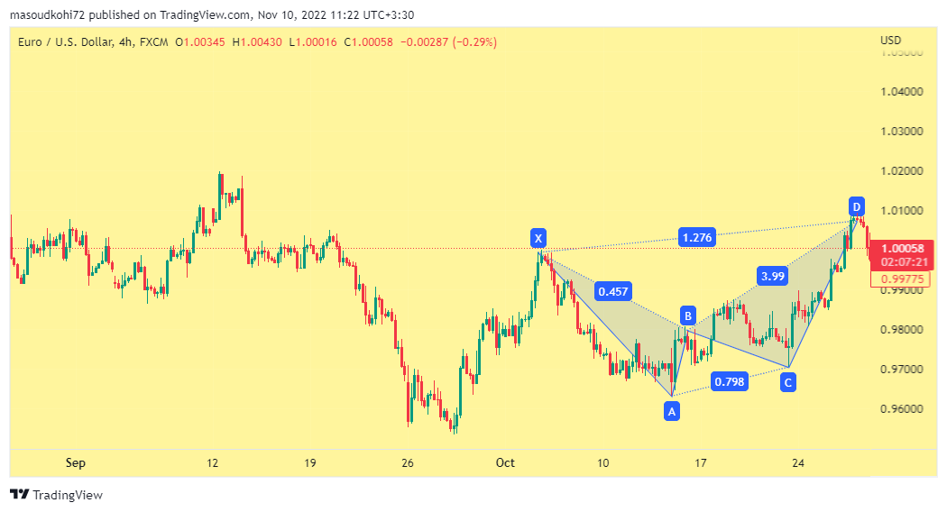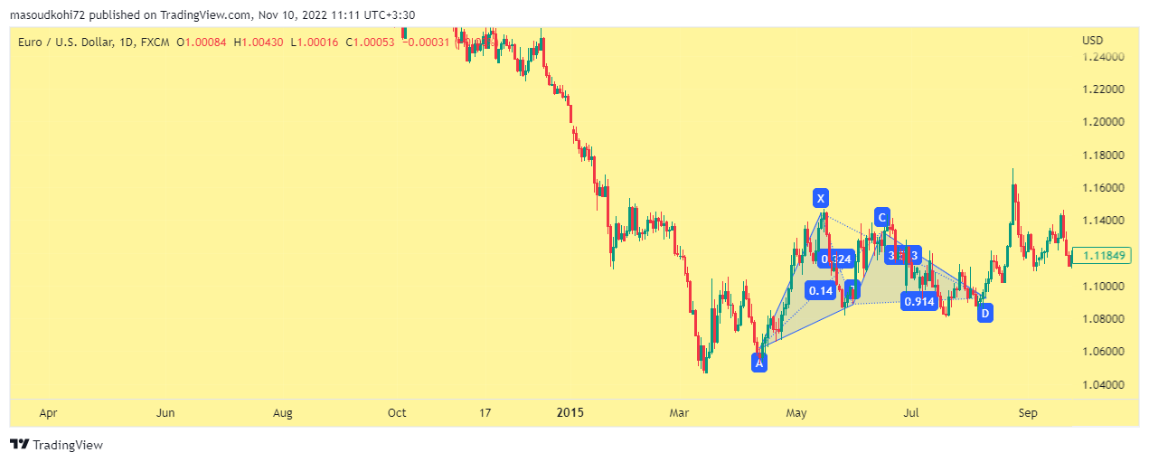 مثال بالا نمونه ای را در Gartley نشان می دهد، نمونه ای که در آن همه نسبت ها کامل هستند. نمودار بعدی یک گارتلی نزولی را در EURUSD نشان می دهد. در این نمودار توانستهایم واکنشی در اطراف سطوح گارتلی داشته باشیم.