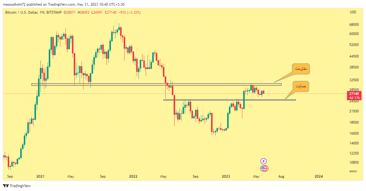 هنگامی که نمودار و بازه زمانی را انتخاب کردید، نوبت به ترسیم دادههای قیمت میرسد. این شامل ترسیم حمایت و مقاومت قیمتهای تاریخی در نمودار است. محور x نشان دهنده زمان است، در حالی که محور y نشان دهنده قیمت است. هر نقطه داده در نمودار مربوط به یک دوره زمانی خاص و قیمت مربوط به آن است.