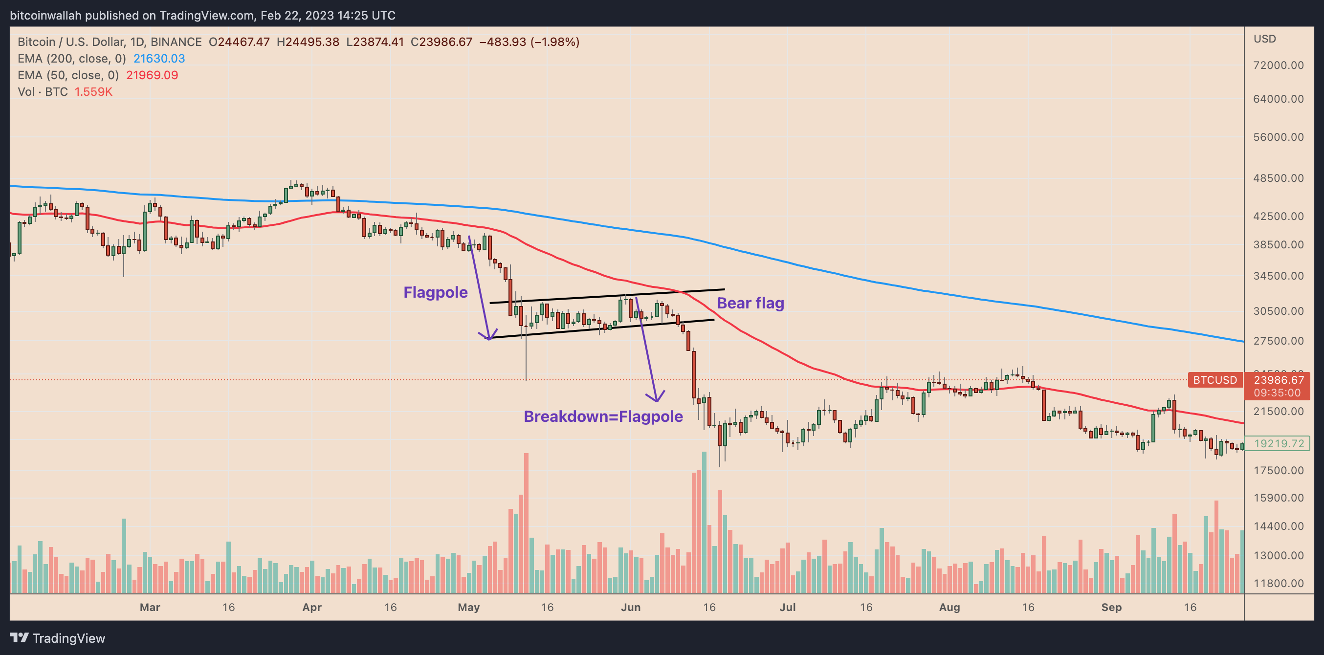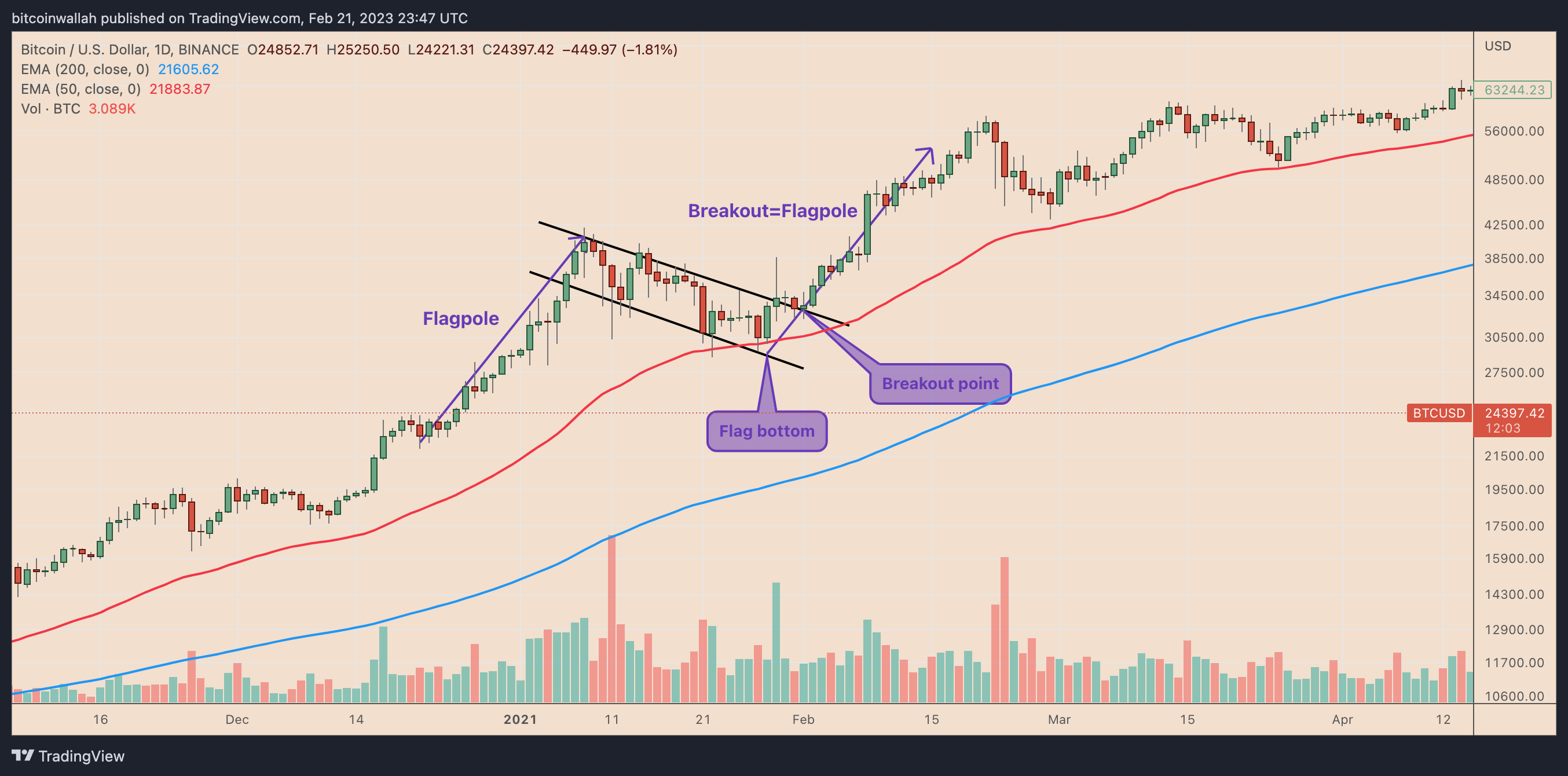 در نمودار بیت کوین ، قیمت در یک پرچم، و به دنبال آن یک بازگشت به سمت بالا در داخل یک کانال موازی در حال افزایش، شکل گرفته است. در نهایت، قیمت BTC از محدوده کانال خارج میشود و به سمت نزول میرود و به اندازه ارتفاع میله پرچم کاهش مییابد.