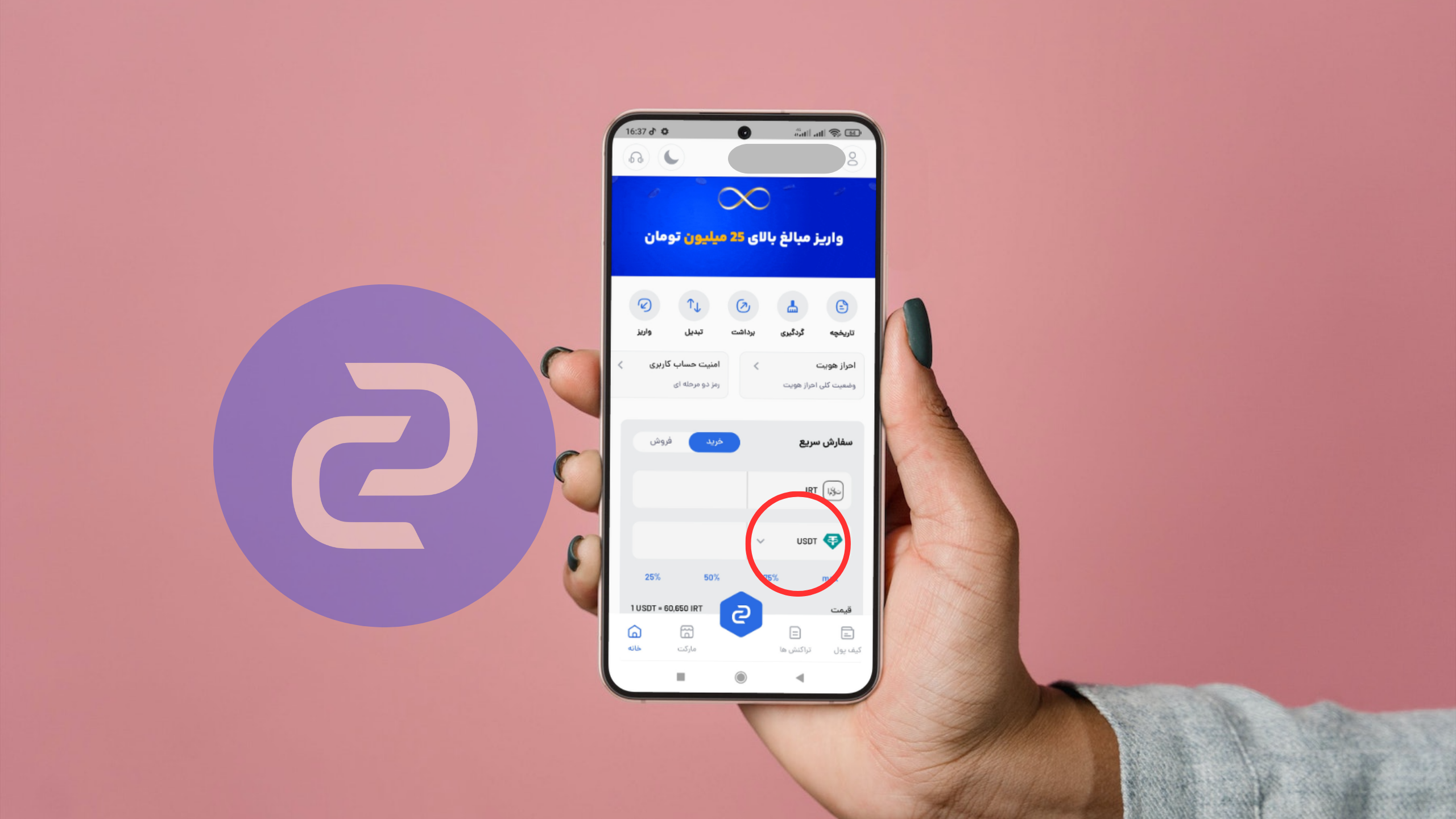 - به جای ارز پیش فرض (که در اینجا تتر است) پرفکت مانی را انتخاب کرده و تعداد پرفکت مانی مورد نیاز یا حجم ریالی که میخواهید با آن خرید کنید را نیز در باکس روبروی پرفکت مانی یا تومان قید کنید.