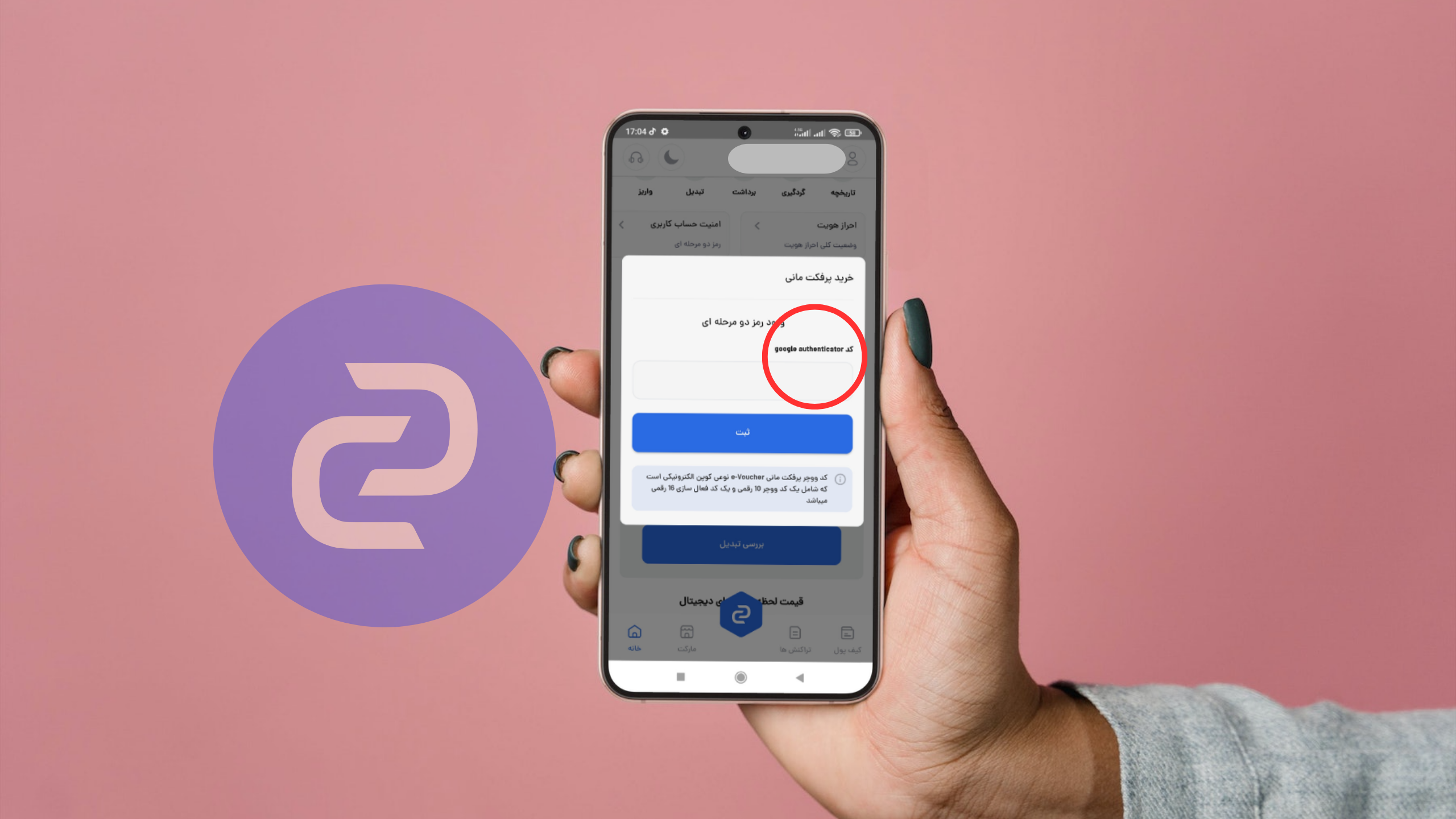 - در این مرحله باید یک کد دو مرحلهای را وارد کنید، چنانچه قبلا Google Authenticator را فعال نکردید با زدن گزینه «ارسال کد» یک کد فعالسازی برای شما به صورت پیامک ارسال خواهد شد.