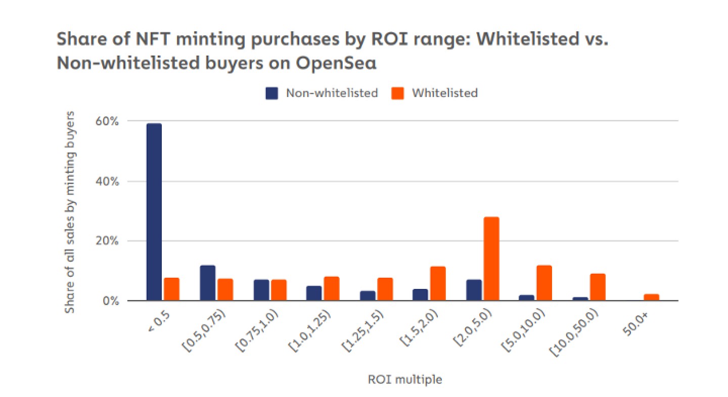 نمودار زیر تفاوت ROI (بازده سرمایهگذاری) را بین کسانی که در OpenSea در حین مینت خرید کردهاند در مقایسه با کسانی که این کار را بدون قرار گرفتن در لیست سفید انجام دادهاند نشان میدهد.